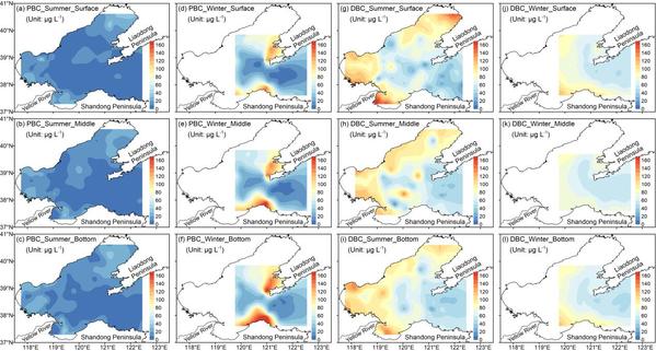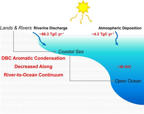 黑碳(Black Carbon, BC)是生物质和化石燃料在不完全燃烧条件下产生的高度芳香碳质副产物,涉及到气候变化、碳循环、环境健康危害等诸多问题,是当前国内外气候和环境等研究领域共同关注的热点。溶解态黑碳(DBC)作为BC降解的中间产物,是海洋溶解态有机碳(DOC)碳库的重要组成部分,涉及全球海洋碳收支,但相关的信息非常有限。本研究基于2014年夏季和冬季在渤黄海大面采集的水体样品,通过对水体中颗粒态BC(PBC)和DBC进行系统分析,并结合团队和其他学者前期在环渤海河流和开放大洋针对DBC开展的相关研究工作,对渤黄海PBC和DBC的时空变化规律和动力学机制以及DBC在沿“河流-近海-大洋”统一体迁移过程中的行为变化进行了细致深入的探讨,获得的主要认识包括:(1)渤黄海PBC和DBC的时空变化主要受控于气候及其诱导的水动力条件(图1);(2)DBC在沿“河流-近海-大洋”统一体迁移过程中,其芳香浓缩程度逐渐降低(图2),可能是由于其在迁移过程中逐渐增加的光化学降解所致;(3)基于我们对DBC定量分析方法的改进和优化,发现前人关于全球尺度DBC的界面通量和全球海洋DBC储库大小的估算结果明显偏低,本研究对其进行了修正,该结果有助于优化DBC的海洋碳循环研究模型(图3)。图1 渤黄海颗粒态和溶解态BC的时空变化(Fang et al., 2020, ES&T)