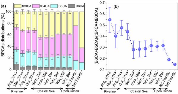 图2 DBC芳香浓缩程度沿“河流-近海-大洋”统一体迁移的变化(Fang et al., 2020, ES&T)